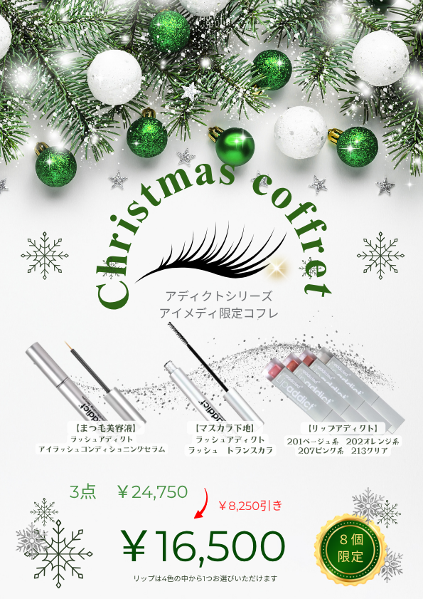 アイメディのオリジナルコフレです!大人気のまつ毛美容液と、リップ、さらにトリートメント効果があるマスカラ下地の3点セットです。リップは好きなカラーがひとつ選べます!