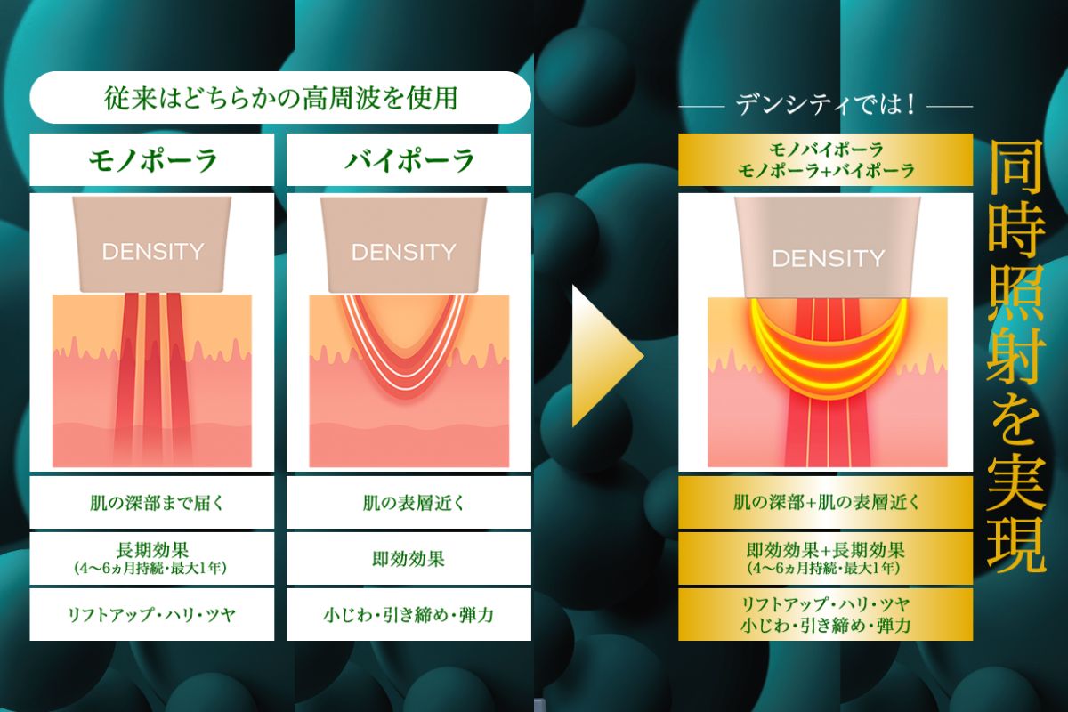 デンシティは、持続効果を発揮する「モノポーラRF」と、即時効果を発揮する「バイポーラRF」を同時に照射することができる最新式のリフトアップマシン(高周波-6.78MHz)RF機器です。モノポーラRFでは皮膚深部に熱を伝え、肌のハリやツヤ感の改善などの美肌効果をもたらします。 バイポーラRFでは皮表層近くに熱を伝え、コラーゲンと繊維組織の収縮を促すことで真皮の弾力性を高め、たるみ改善や小じわの改善をもたらします。